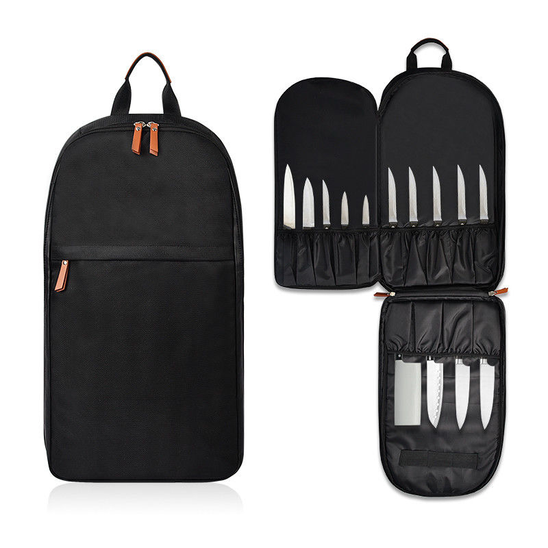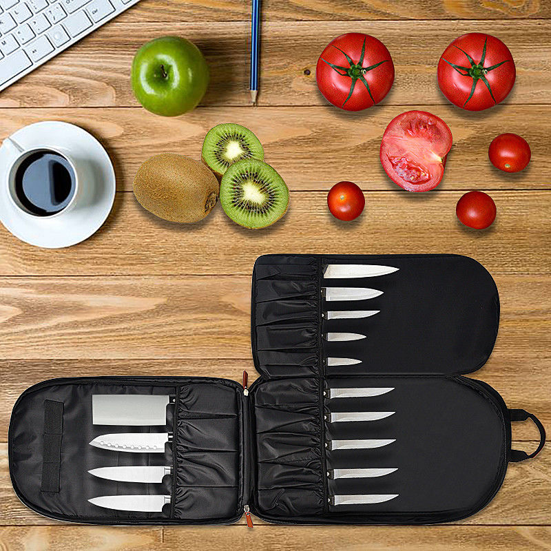 - Κρατά ευρεία γκάμα μαχαιριών και εργαλείων. Το ρολό μαχαιριού έχει 21 τρύπες για μαχαίρια, από τα μαχαίρια κοπής μέχρι τα μαχαίρια 18 χιλιοστών.4 τρύπες για γευστικές κουταλιές, και μια τσάντα με φερμουάρ για επιπλέον εργαλεία!